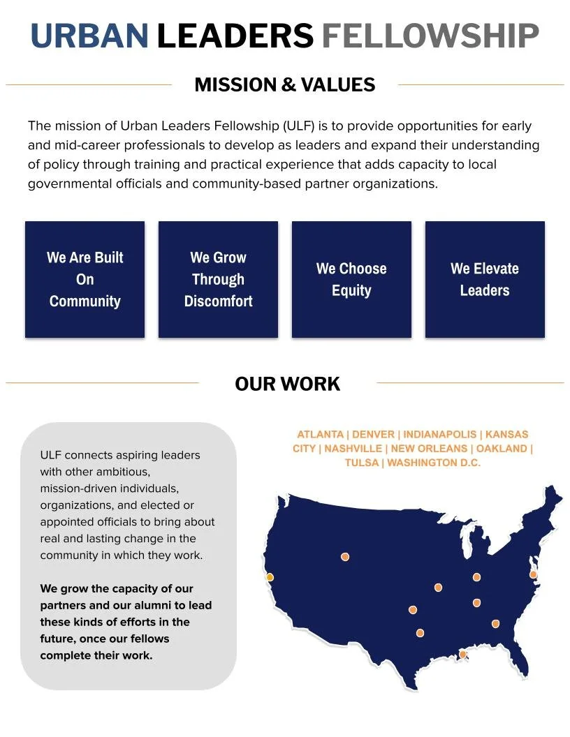 ULF connects aspiring leaders with other ambitious, mission-driven individuals, organizations, and elected or appointed officials to bring about real and lasting change in the community in which they work.
